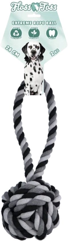 Dit geweldige flostouw is gemaakt van 100% natuurlijk katoen, waardoor het veilig, duurzaam en milieuvriendelijk is. Perfect voor apporteer- en trekspelletjes met honden. Tijdens het spelen helpt het flostouw om de tanden en tandvlees te reinigen. Dankzij de speciale vlechtwerktechniek waarbij alleen hele draden worden gebruikt, is het flostouw strakker gevlochten en veel sterker dan reguliere flostouwen. Bovendien is het gemaakt van gerecycled materiaal, dus het is niet alleen goed voor je hond, maar ook voor het milieu.