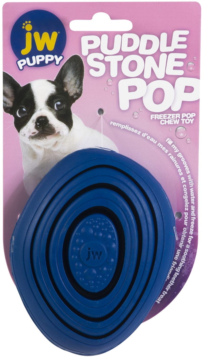 Verlicht de pijn bij het doorkomen van tandjes van uw puppy met JW’s® Puddle Stone Pop™Bijtring. Geïnspireerd door de natuur om het perfecte bijtspeeltje te maken, heeft de Puddle Stone Pop groeven om water te laten bevriezen en ijzige vlakken te creëren die uw puppy de broodnodige verlichting geven van pijnlijk tandvlees veroorzaakt door tandjes krijgen. Terwijl uw puppy kauwt, masseert het zachte rubber en het geribbelde oppervlak het tandvlees zachtjes, terwijl de ijzige groeven pijnverlichting bieden. Als de tandjesfase voorbij is, verander je dit vries bijtspeeltje in een leuk traktatiespeeltje door pindakaas of tandpasta gemaakt voor honden in de groeven van het speeltje te smeren.